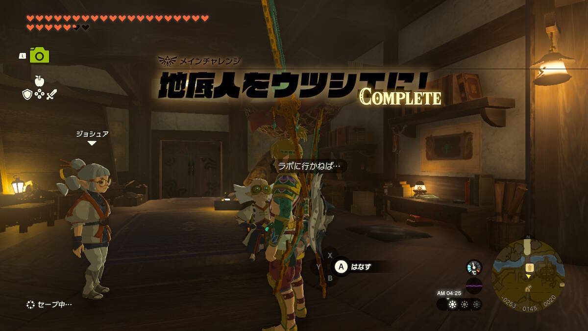 ゼルダと2人で絶対に帰って来てねと見送られ、ここでメインチャレンジ『四地方の異変調査』が完了となりました。